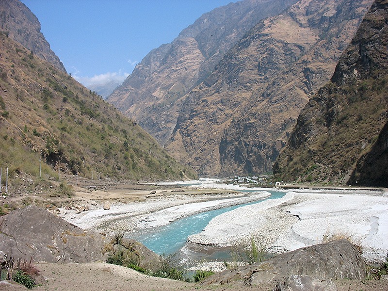 Рядом с ней из маленького ущелья течет Дхуна Кхола и сливается с Марсьянгди. Я не знаю, что передает эта фотография, но я очень долго сидела здесь на берегу: