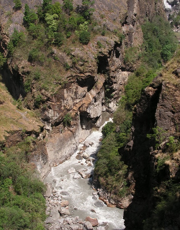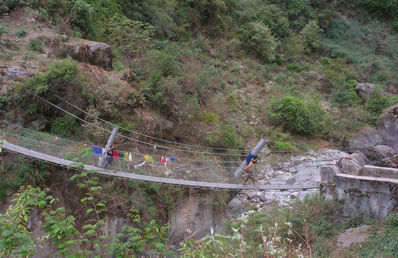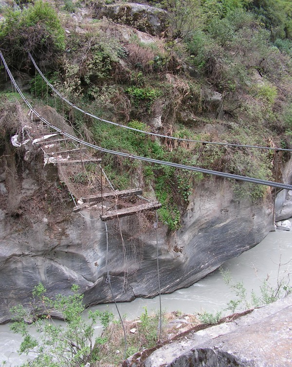 Вот так выглядели мосты раньше. Подобные стремные конструкции и поныне кое-где остались на треке к базовому лагерю Аннапурны. Ну, разве что там деревяшек чуть побольше.