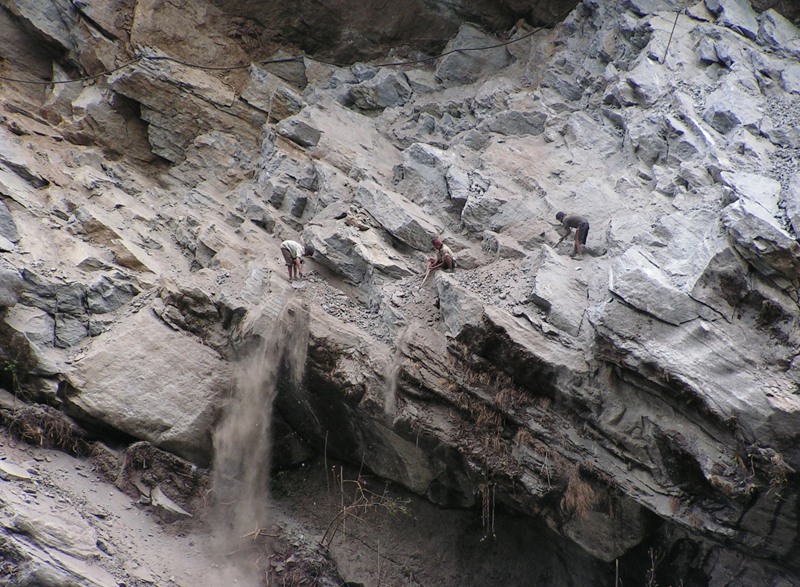 Строительство дороги на другом берегу. Сперва закладывают взрывчатку, потом остатки взорванной породы просто скидывают в пропасть: