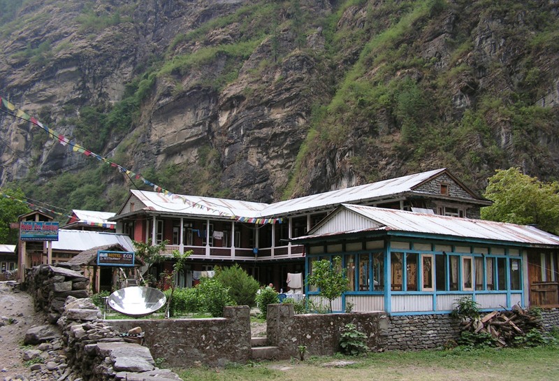 Комнаты обиты деревом, кормят очень вкусно - помню, был тыквенный суп и жареные момо с сыром.
