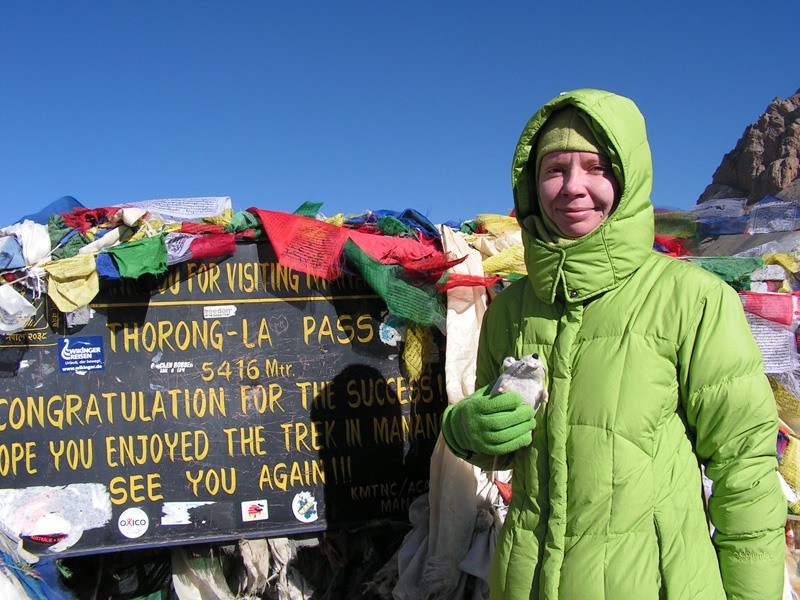 Когда мы вышли, наконец, на перевал, соображала я уже с трудом. Сантош говорит, что мы там просидели чуть ли не полчаса, по моим внутренним часам прошло едва ли больше пять минут. Я помнила, что мне надо что-то сделать, и пыталась организовать себя. С первым пунктом мне помогли французы: они радостно подбежали, поставили меня возле перевальной таблички и запечатлели: