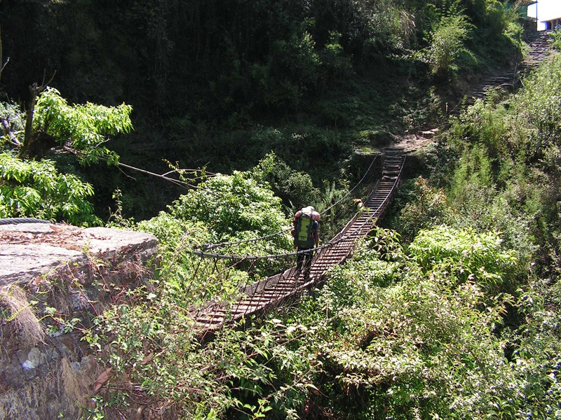 Надо сказать, что мосты на треке к базовому лагерю находятся в гораздо более плачевном состоянии, чем на треке вокруг Аннапурны. Если до этого мы шли по новым стальным мостам, то сейчас все чаще попадался колоритный деревянный ахтунг.