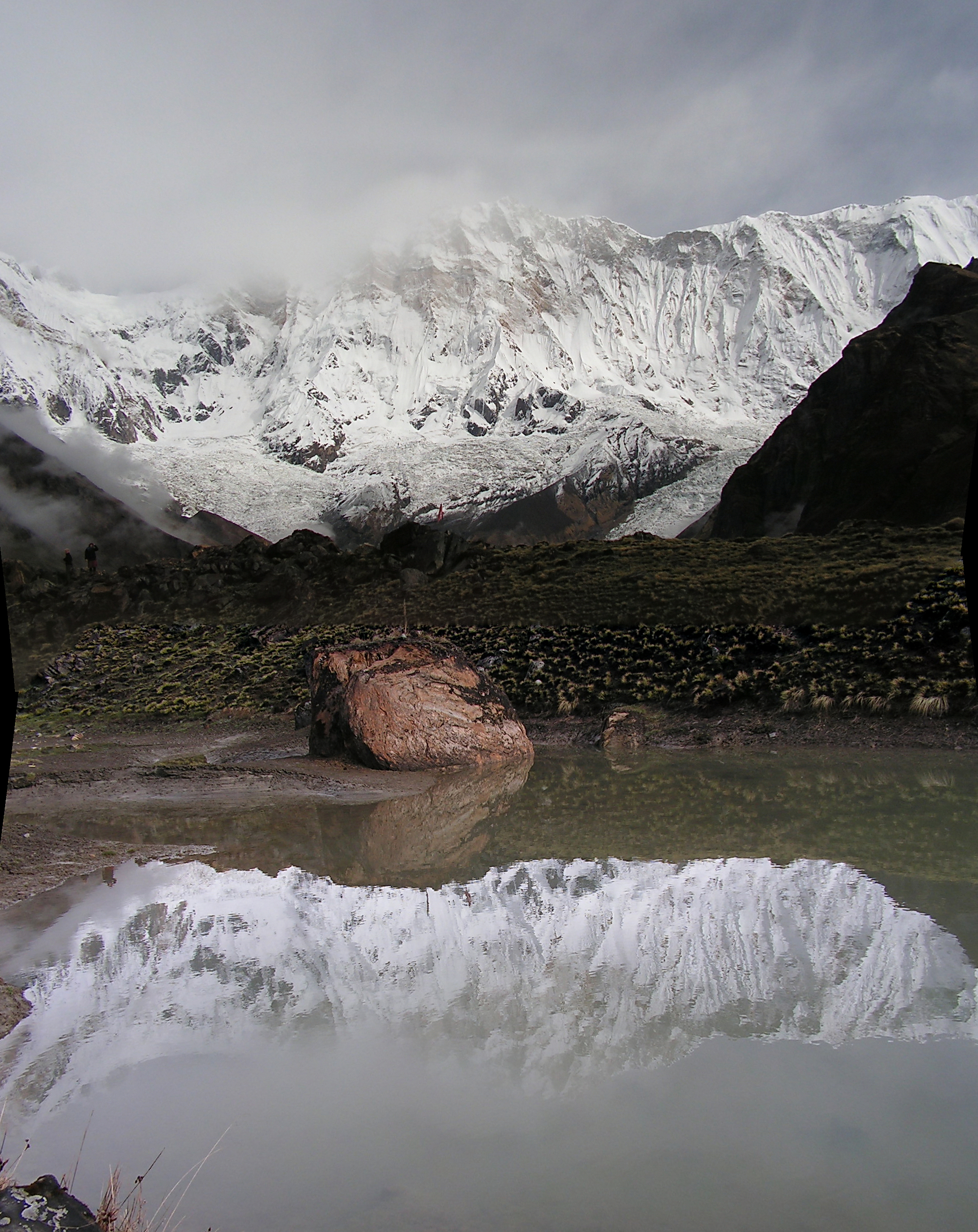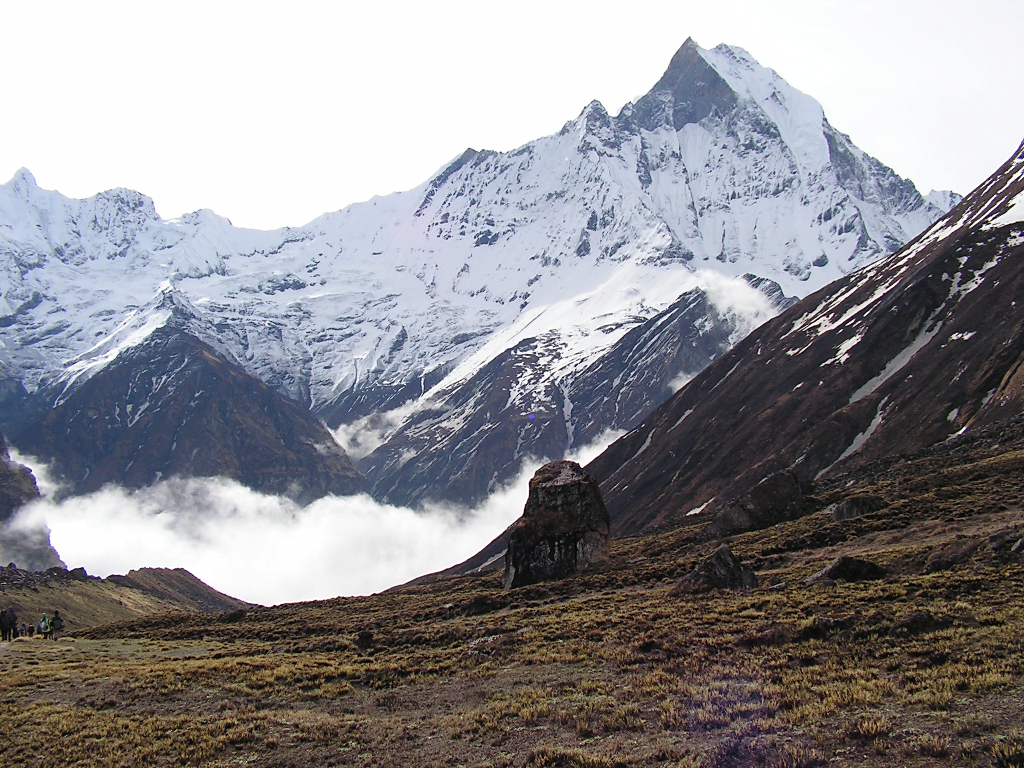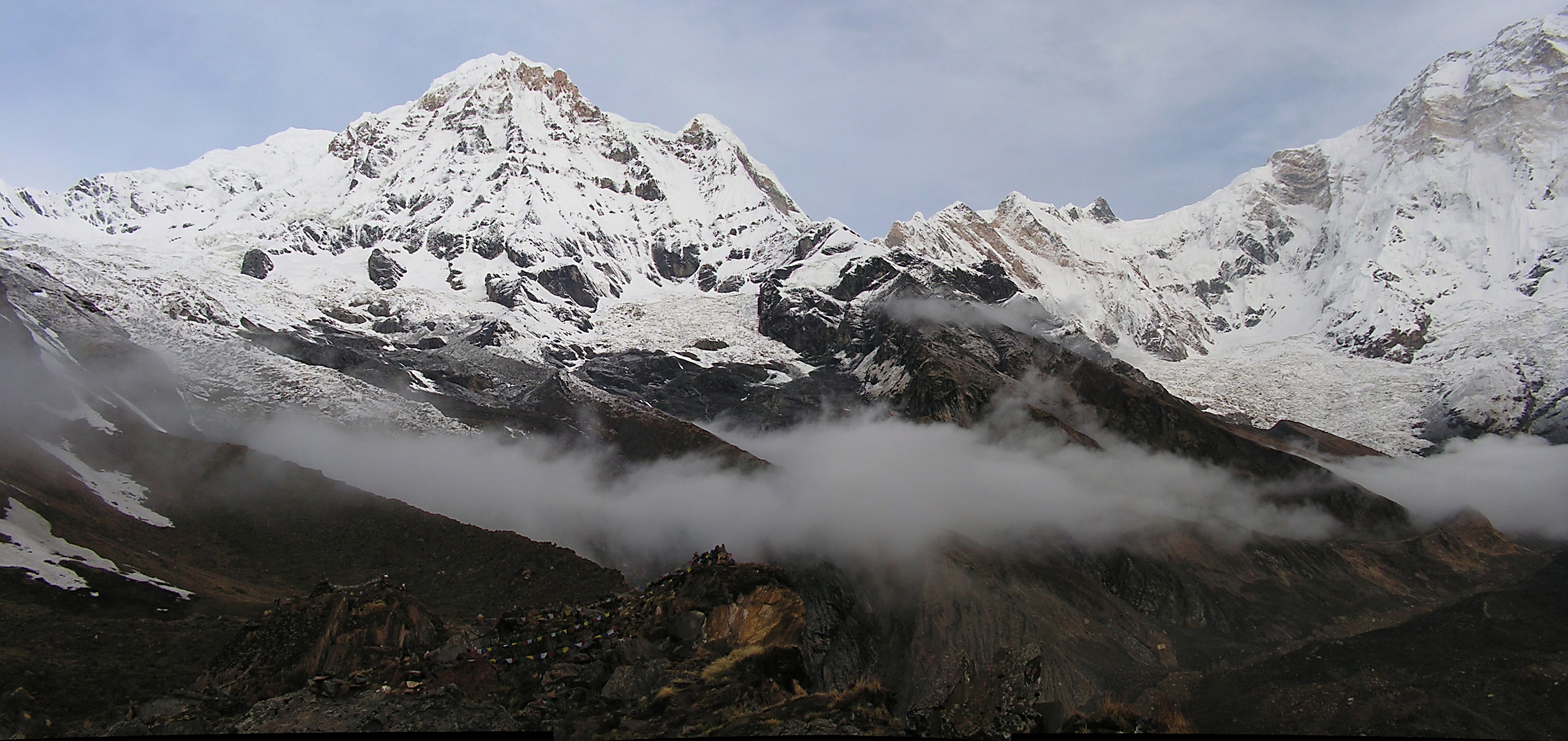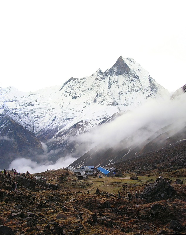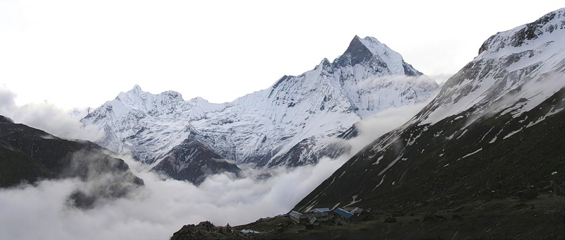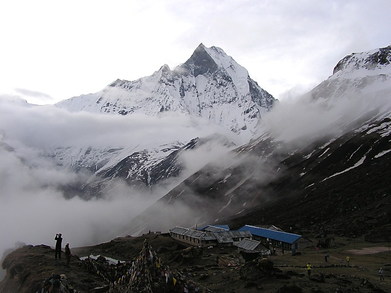 Туман еще не до конца рассеялся. Вид на Мачхапуччхаре и базовый лагерь:
