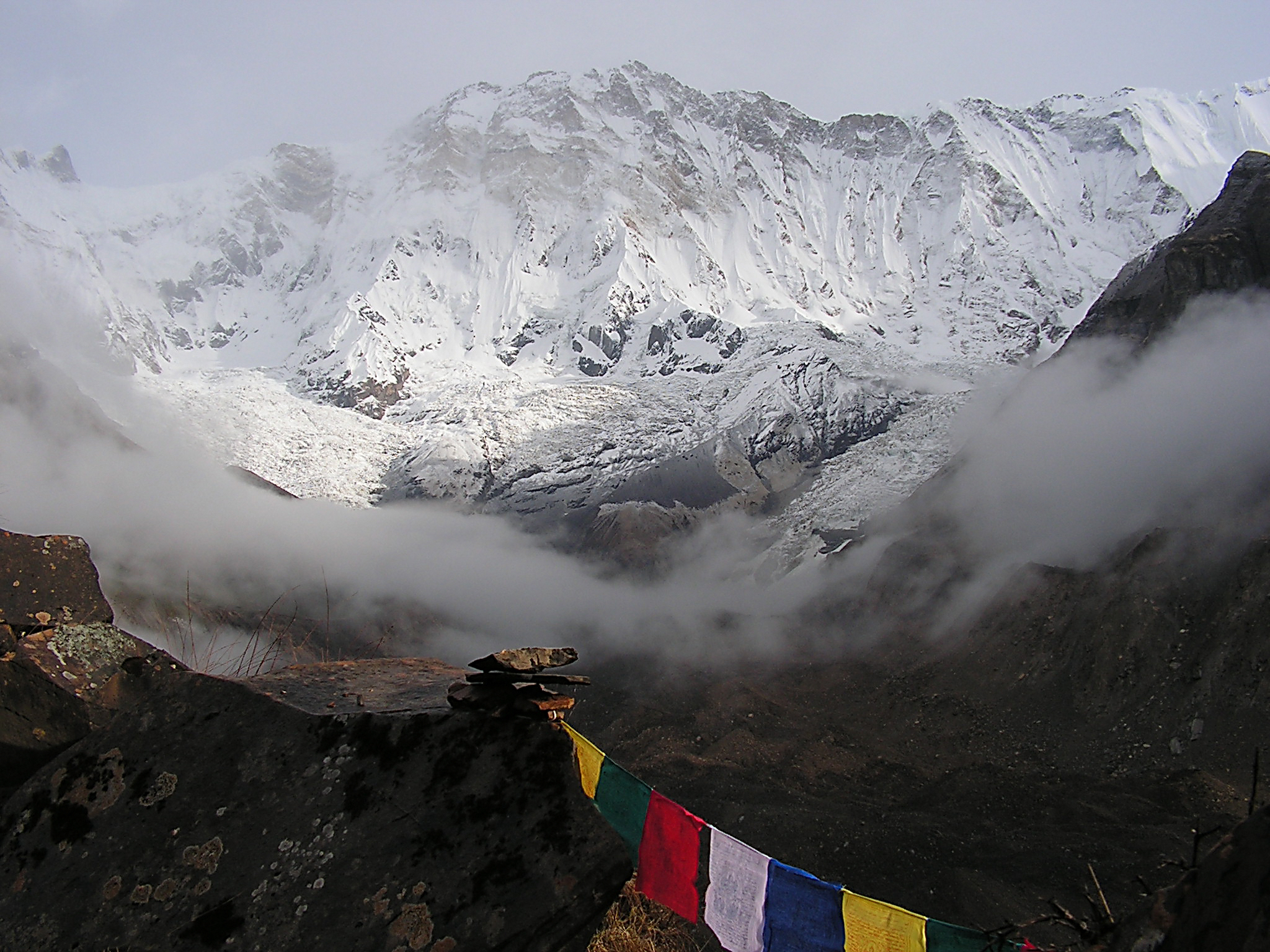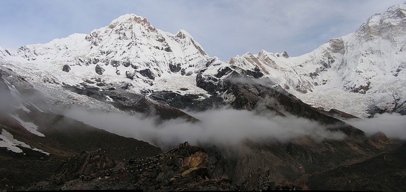 Мачхапуччхаре и окрестности базового лагеря. На переднем плане сложенные из камней ступы, на которых находятся памятные таблички погибшим. При попытке восхождения на Аннапурну гибнет очень много людей, поэтому желающих сильно меньше, чем на другие восьмитысячники.