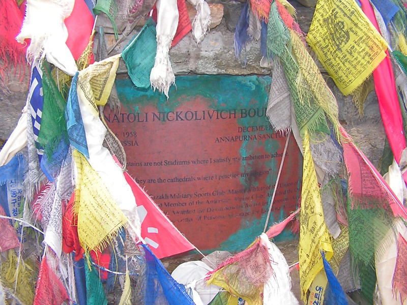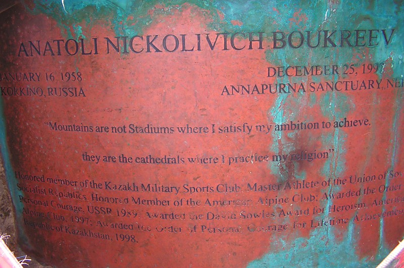 Это и не могила вовсе, а памятная табличка. Анатолий Букреев был выдающимся альпинистом, покорил несколько восьмитысячников, работал гидом на Эвересте. В 1996 году, когда коммерческие группы попали там в непогоду и много людей погибло, он спас двух женщин. На той смертельной высоте, откуда никого обычно не спасают. А через год сам погиб в лавине на Аннапурне. Его уже некому было спасти.