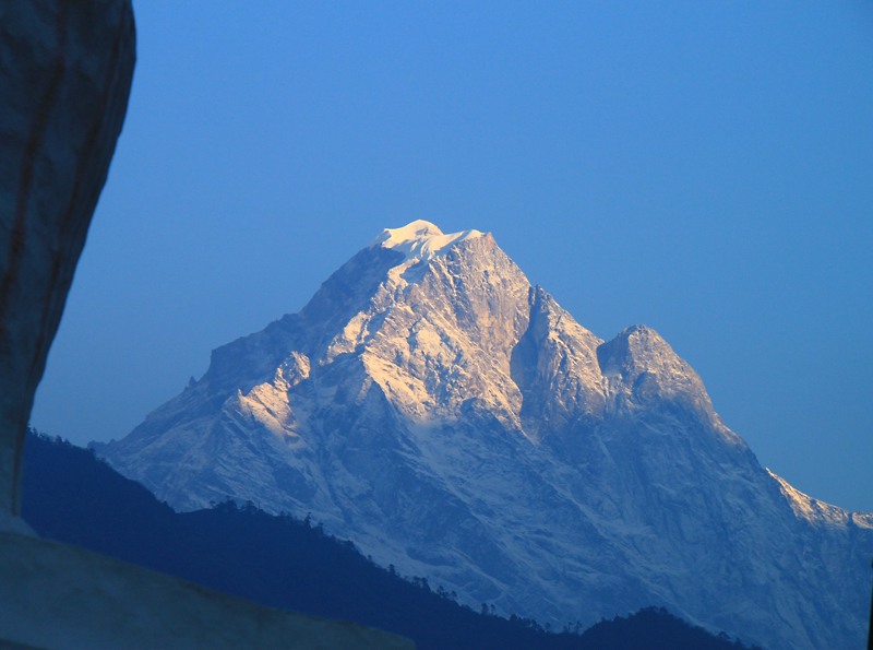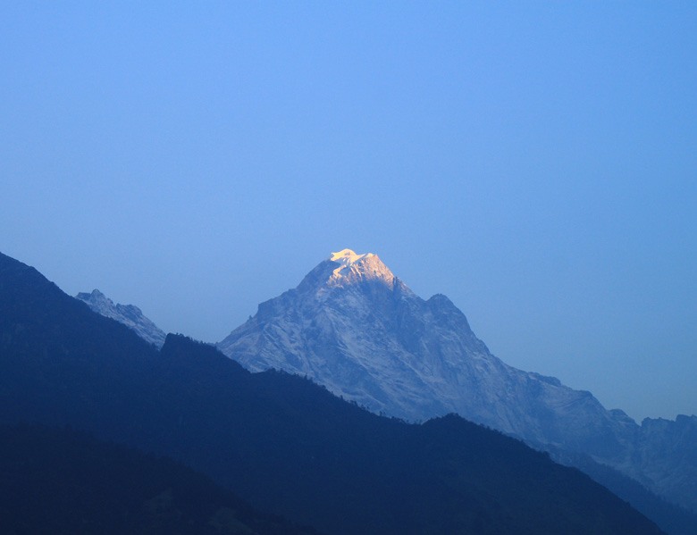 Что за гора отсюда видна, мы не знаем. Возможно, это вполне безымянный пятитысячник, каких много в Гималаях.