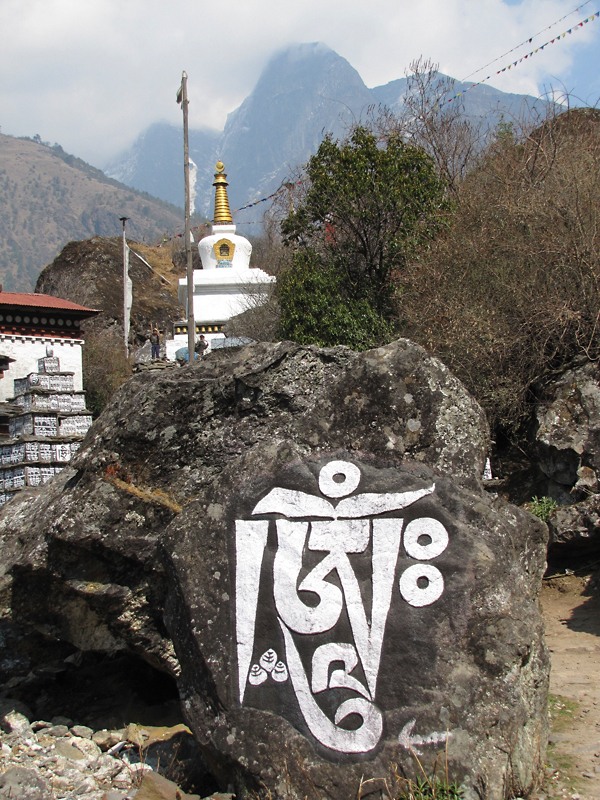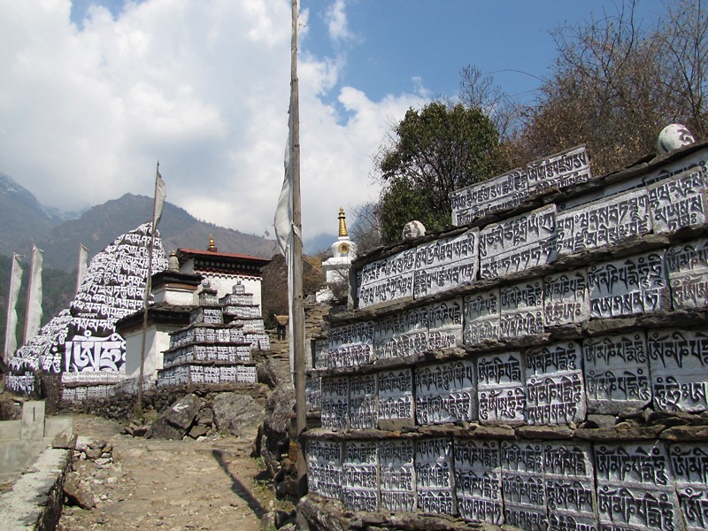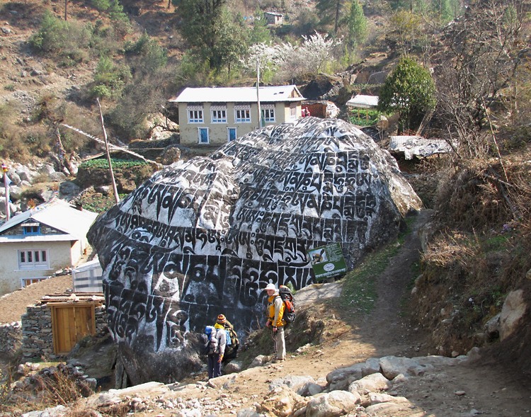 В деревнях по дороге очень много стен с мантрами. Мантры рисуют на камнях или на специальных