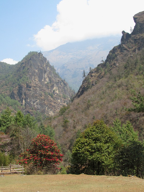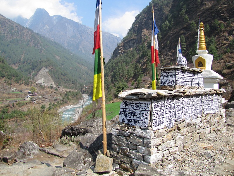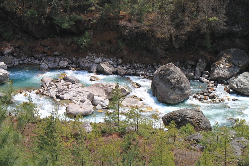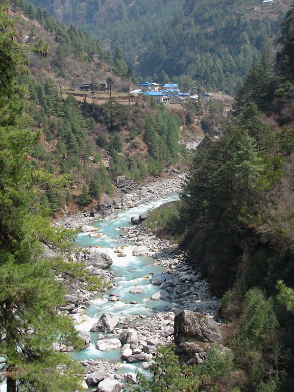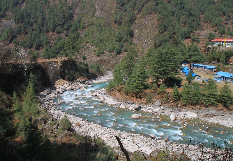 Берега реки Дудх Коси здесь становятся круче, дорога по подвесным мостам переходит то на один, то на другой берег: