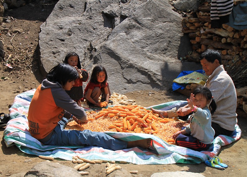 Местные жители чистят кукурузу. Дети не пришли к соглашению, надо ли их фотографировать: