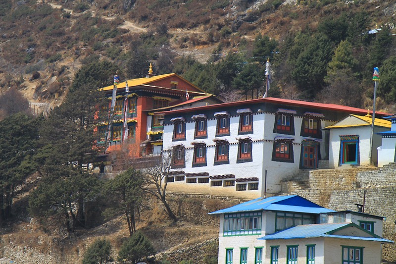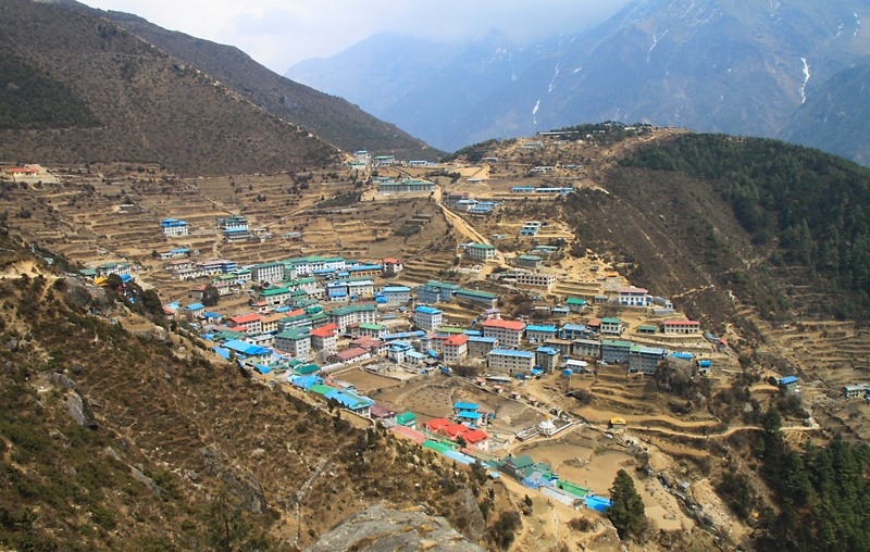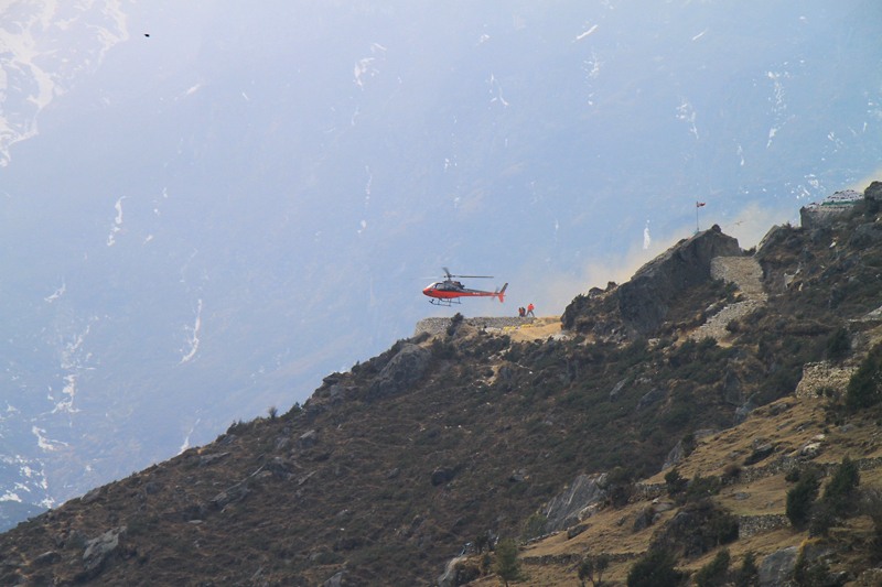 Если пройти от гомпы к краю города, можно попасть на вертолетную площадку. Отсюда улетают те, кому лень идти вниз - точно можно улететь в Луклу, с вероятностью есть доставка до Катманду. Вертолет меньше самолета зависит от погоды, и предложение пользуется спросом.