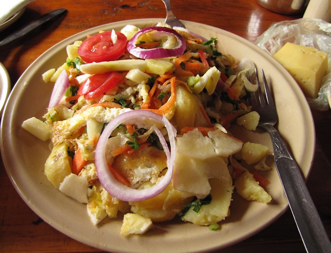 Майонеза там нет, конечно, но нам было очень смешно. Блюдо по имени russian salad в Юго-Восточной Азии весьма распространенное, но в каждой стране и в каждом городе этот сытный салат с вареной картошкой понимают по-своему. В Покхаре, помнится, в этом салате помимо картошки фигурировали бананы, апельсины и яйца.