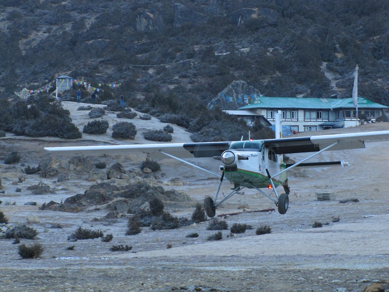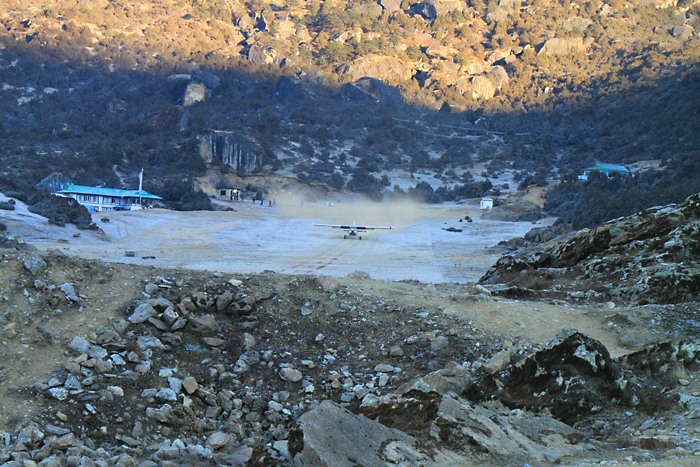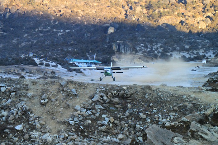 Выше Намче есть деревушка Сьянгбоче. Домов мы почти не видели, зато тут есть грунтовая взлетная полоса для крошечных самолетов. Регулярных рейсов в Сьянгбоче нет, только договорные. Вообще-то прилететь снизу сразу на 3800 м. себе дороже, веселое самочувствие должно быть обеспечено. Но богатые и страшно занятые люди все равно летают.