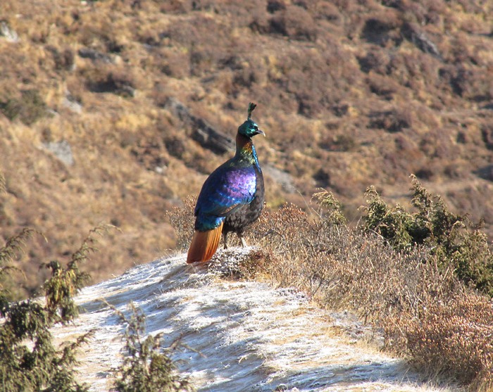 Удивительно, как такое яркое создание способно выжить в столь суровых условиях. На следующий день этот склон скроется под снегом, высота здесь около 4000 метров.
