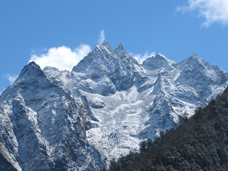 Тут в седле сидит облако. А эту прекрасную гору справа от Кангтеги, представьте себе, никак не зовут. Просто гора и все.