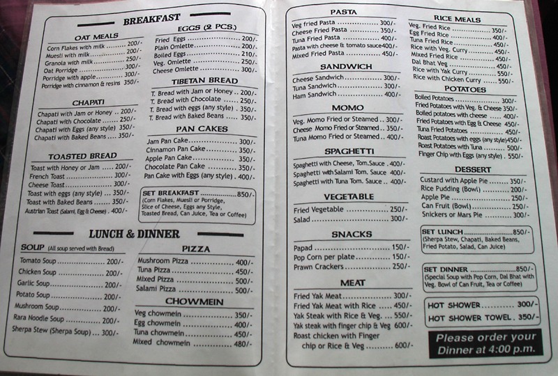В Тьянгбоче очень мало жилья, всего пять-шесть лоджий. Не случайно многие советовали мне идти дальше и останавливаться в соседних поселках. Осенью так и следует делать, просто нет мест. Но в нашем случае места были, и мы заселились в Thyangboche GH, одноэтажный, относительно новый и, как оказалось, впоследствии все равно загруженном до предела. Здесь прием треккеров поставлен на поток и хозяйство напоминает хорошо отлаженную машину. Управляет этой машиной крепкая и деловитая хозяйка. Есть свои плюсы - еда очень неплохая, в умывальники поутру наливают теплую воду (такого больше не было на треке нигде!). Но гестхаус заполнен всегда, потому что обслуживает группы.
