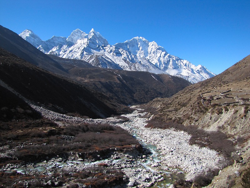 Позже мы встретили ребят из Новосибирска, которые ходили гулять из Дингбоче к озерам, которые расположены на другом берегу реки под Ама Даблам. Почему-то они не замерзают, хотя в марте все озера в горах подо льдом. Они рассказывали, что там красиво, и рекомендовали этот маршрут, он небольшой (как раз на оставшуюся половину дня). Если бы мы знали про него, то не пошли бы непонятно куда вверх по склону, потому что озера, несомненно, интереснее.