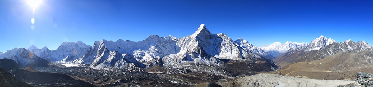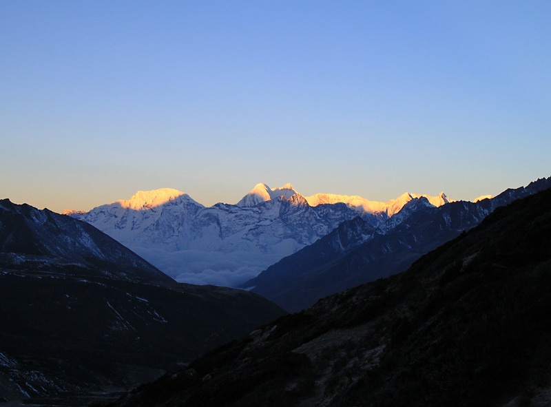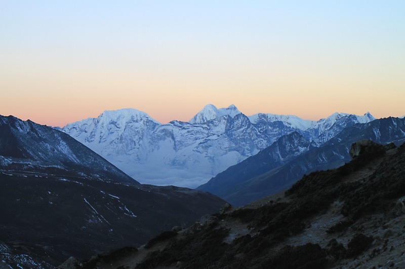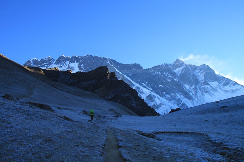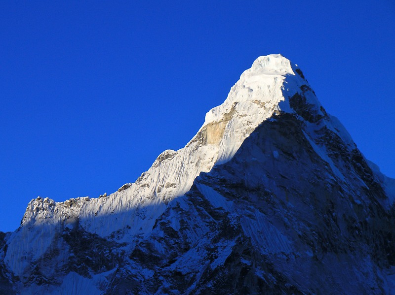 Прямо переда нами стояла Ама Даблам и светилась отраженным светом. К сожалению, от первых рассветных лучей она загорожена более высокой Лхоце.