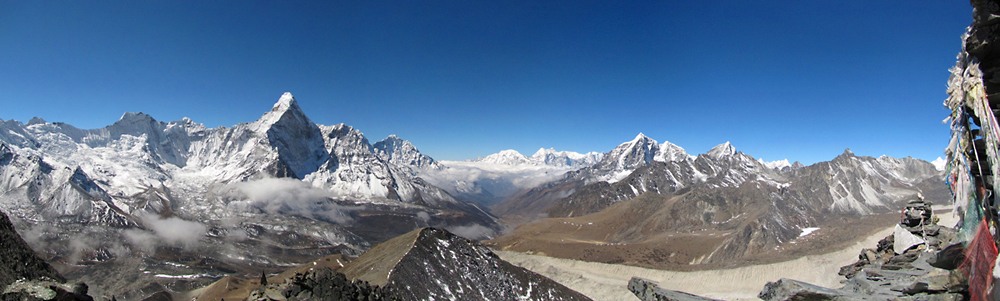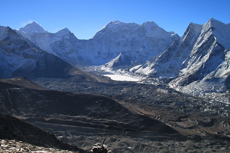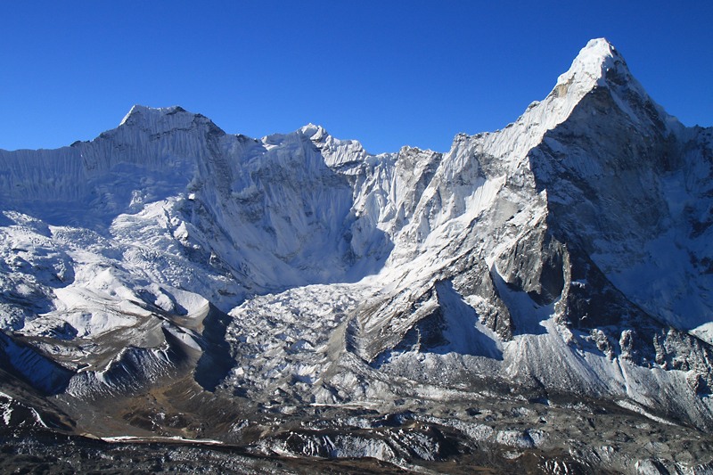 Пирамидальная вершина слева должна быть восьмитысячником Макалу. Но отсюда он далеко. Также по этой долине начинается путь к Айленд пику.