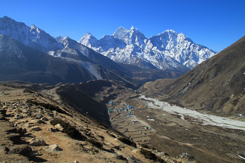 В начале пути по долине Кхумбу Кхола есть крошечный поселок Дугла, единственный ночлег между Периче и Лобуче. Кажется, лодж в Дугле всего один. Путеводитель рекомендует останавливаться там тем, кто идет снизу. Но мест может не быть и на Дуглу лучше не рассчитывать.