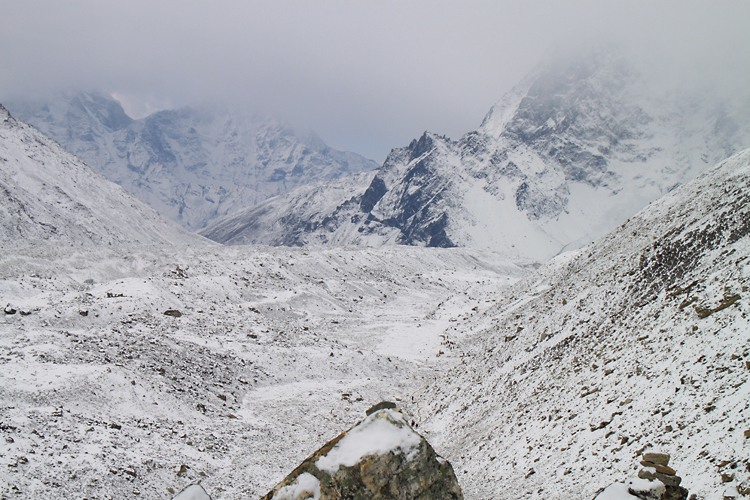 Река в долине быстро прячется под ледник Кхумбу. Сперва он выглядит как нагромождение камней.