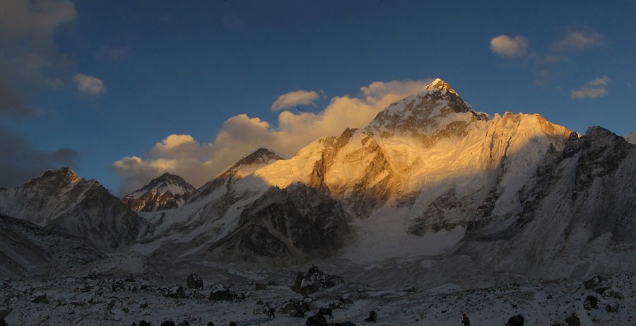 Вечером небо внезапно расчистилось. Если бы мы забрались немного вверх по склону, то увидели бы Эверест на закате. Но тучи разошлись внезапно. Поэтому у нас есть только закатная Нупце.
