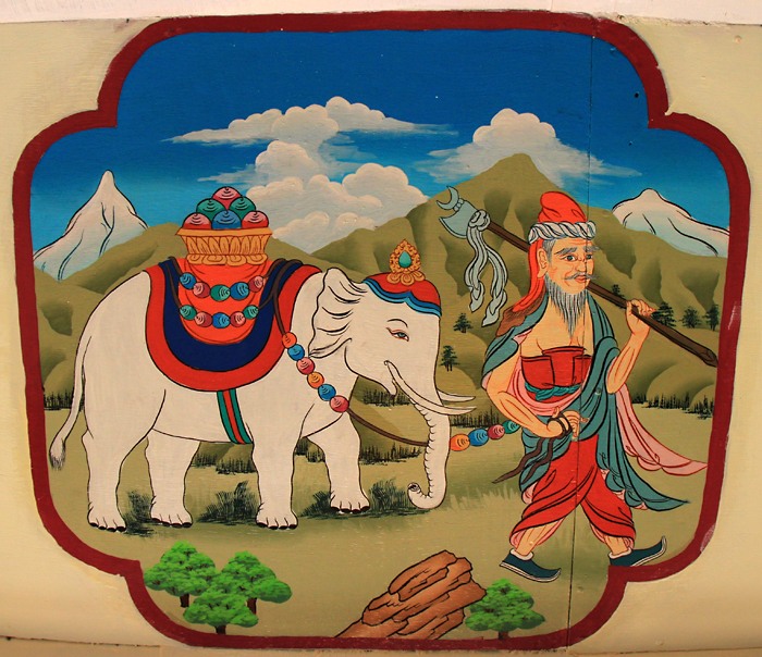Подозреваю, что нарисован Марпа. Символическое изображение буддийского учения в виде драгоценностей, нагруженных на коня или слона.