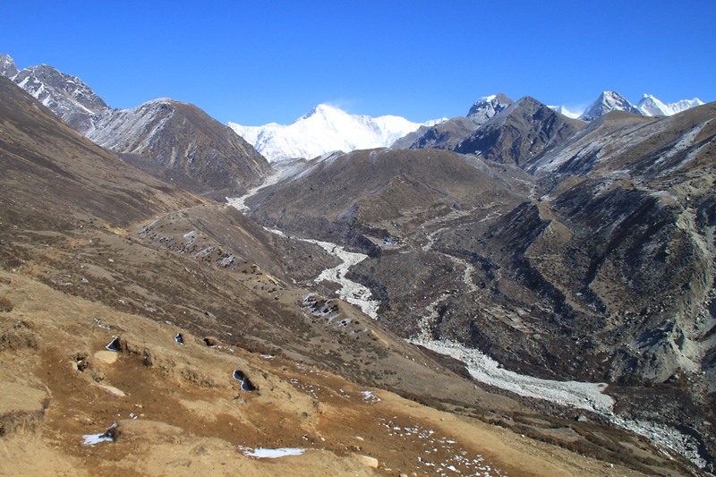За поселком есть вал, за которым открывается вид на ледник Нгозумпа.