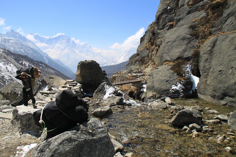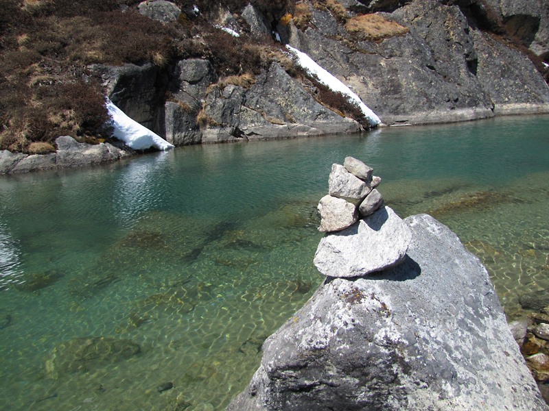 А еще мы увидели возле озера странное зрелище. Один из носильщиков группы нес не рюкзак, а мальчика лет 10-12. Мальчик сидел у него на закорках и имел мученический вид. Сперва мы решили - инвалид, наверное, понесли ребенка горы показать. К нашему удивлению оказалось, что мальчик способен ходить сам (вниз из Гокио он шел на своих ногах), только вверх почему-то делать этого не хотел.
