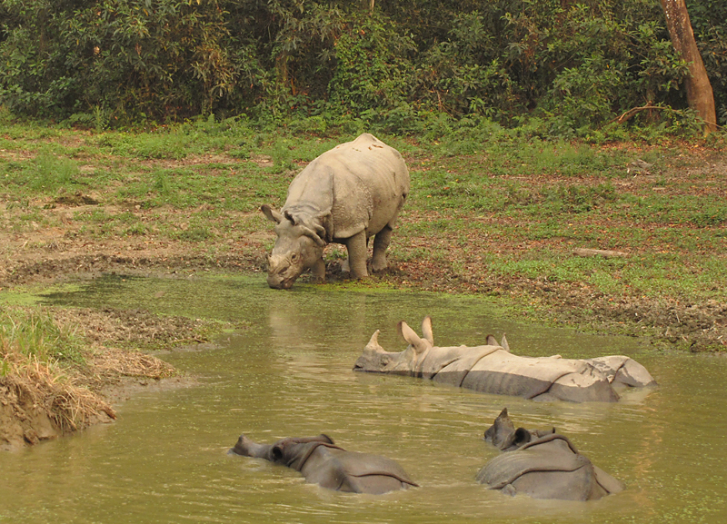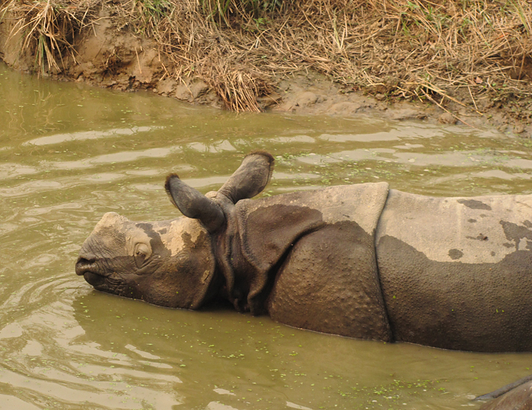 Иногда носороги входят в пограничную реку и нежатся там вместе с крокодилами.