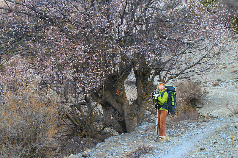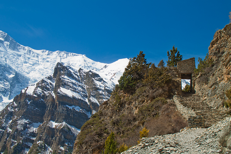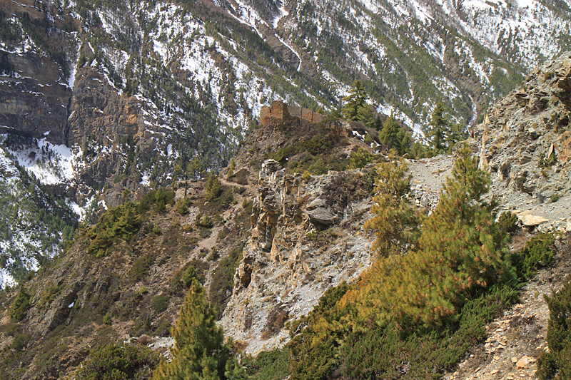 Из Верхнего Писанга до Гьяру дорога сперва пологая, а потом идет крутой, достаточно тяжелый подъем на гору. Этот переход занял у нас два часа с небольшим, включая отдых на многочисленных каменных скамеечках.
