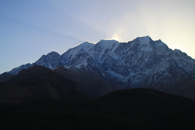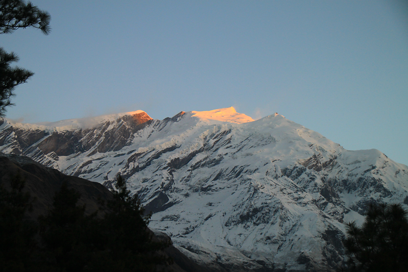 А с другой стороны начинается рассвет на Дхаулагири, которая тоже на себя не похожа, особенно для тех, кто привык смотреть на нее с Пунхилла.