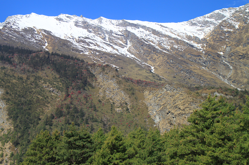 Вот тут горный склон, на котором виден рододендроновый красный пояс.