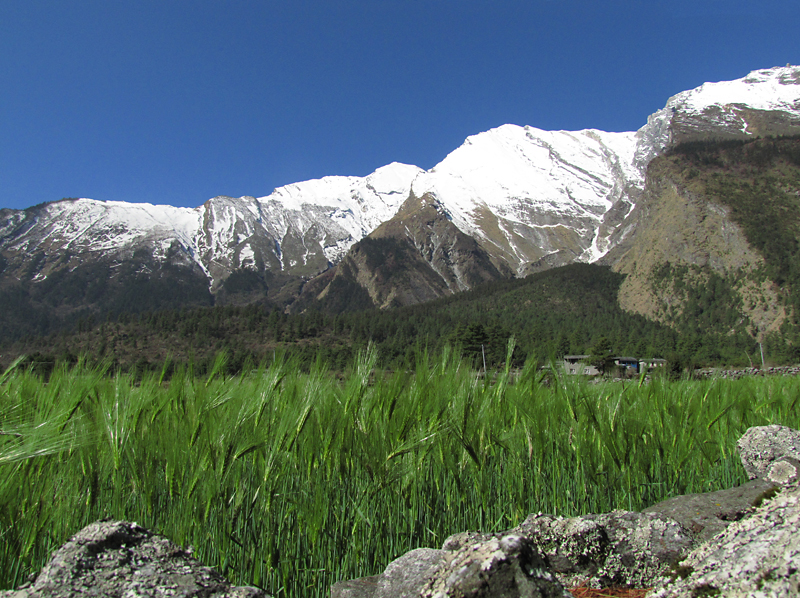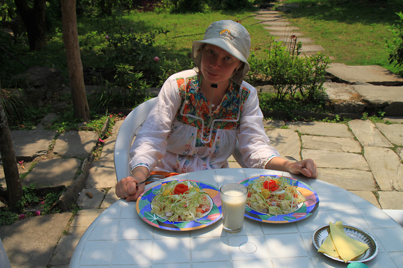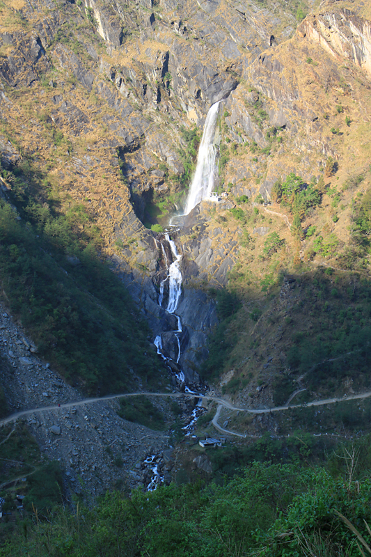 Обедали в Гхасе, после обеда шли еще часа три, пока не устали. В результате не дошли до намеченного поселка Дана и остановились в малюсеньком поселочке Копчепани. Место тихое, приятное, столики на травке и вид на огромный водопад Рупсе Чхахара, что с другой стороны ущелья. Условия там самые простые, комнаты типа сарай, теплая вода дается в ведрах. Но место благостное. Там же нас догнали Наташа и Рома из Хабаровска, так что за ужином мы были в приятной компании.