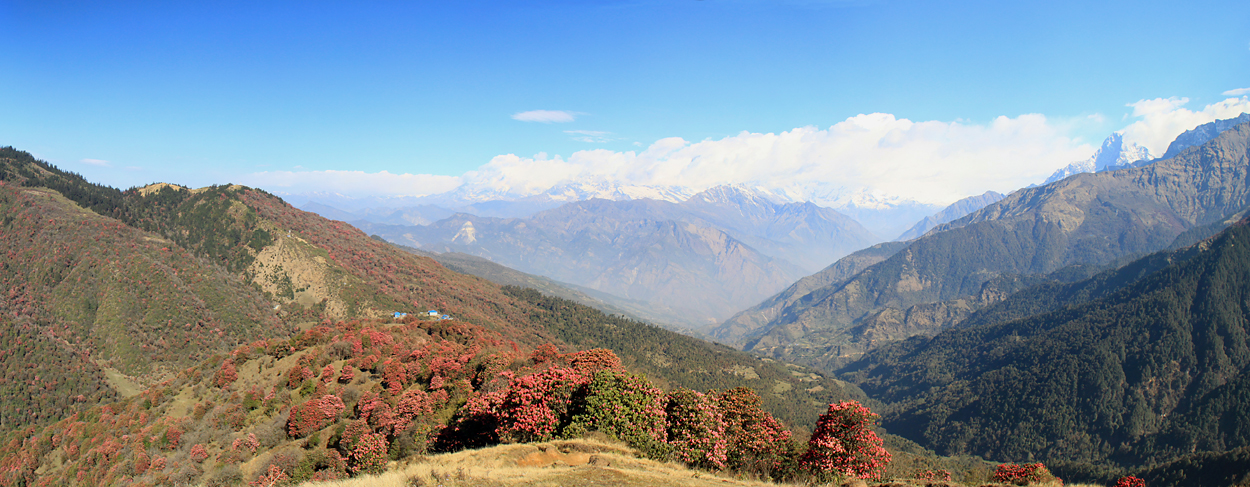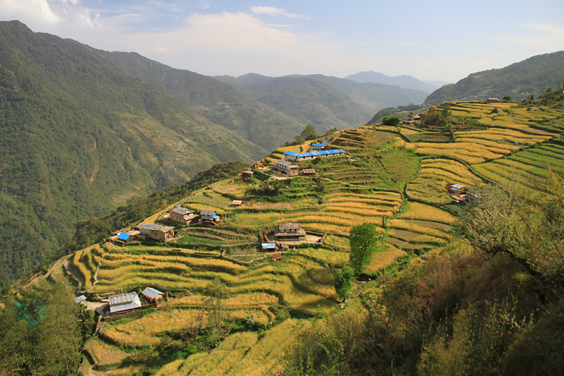 Оказалось, что в Комронге есть пара лоджей и сюда водят гулять группы из Гхандрука, полюбоваться окрестными долинами. Мы как-то увлеклись дорогой и мало фотографировали во второй половине пути. От Комронга надо карабкаться наверх, где стоял тот самый "Little paradise". К этому времени мы уже стали уставать, и, по-хорошему, надо было остановиться в маленьком раю. Он представляет из себя площадку с простенькими, но милыми сараюшками, вокруг которых растут цветы, а на газоне в полном релаксе лежат случайные постояльцы. Но я хотела вниз, к горячим источникам, а Ран хотел сока. А сока в рай не завезли. Пришлось выпить мятного чаю и спускаться.