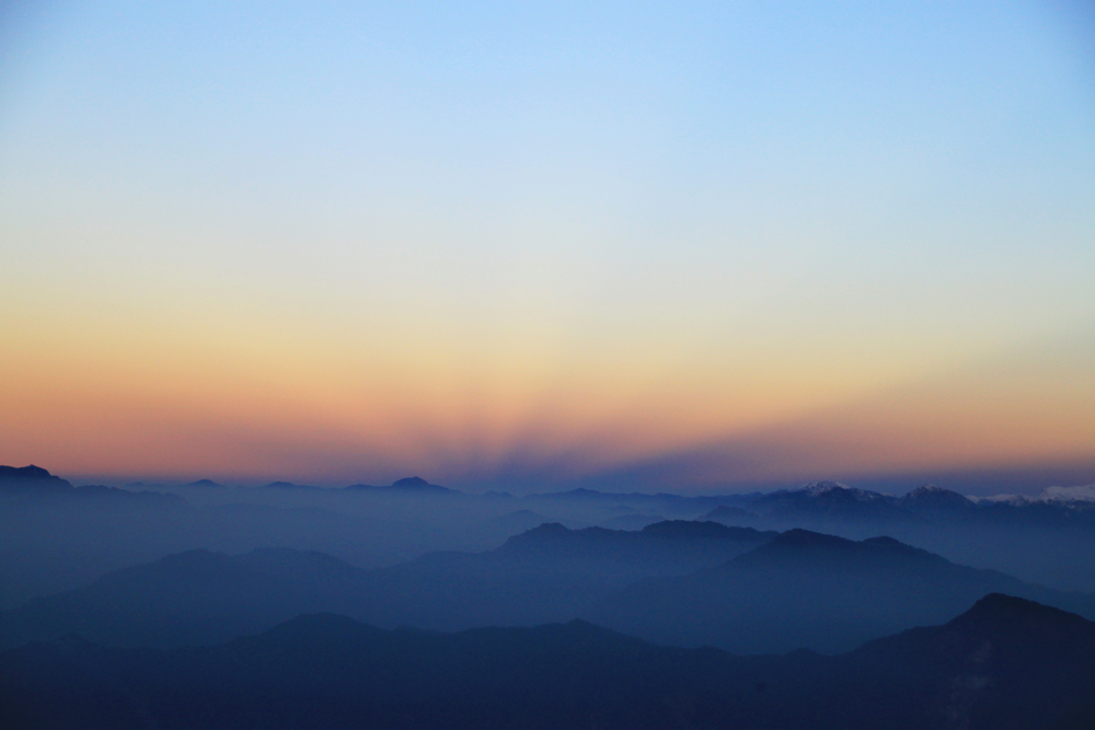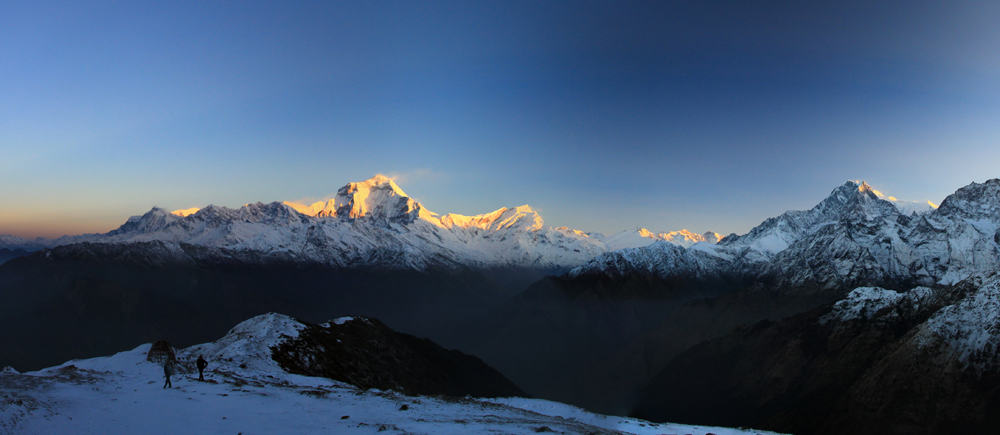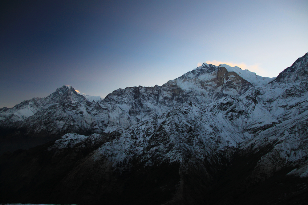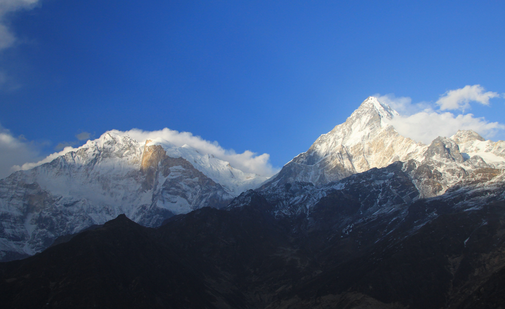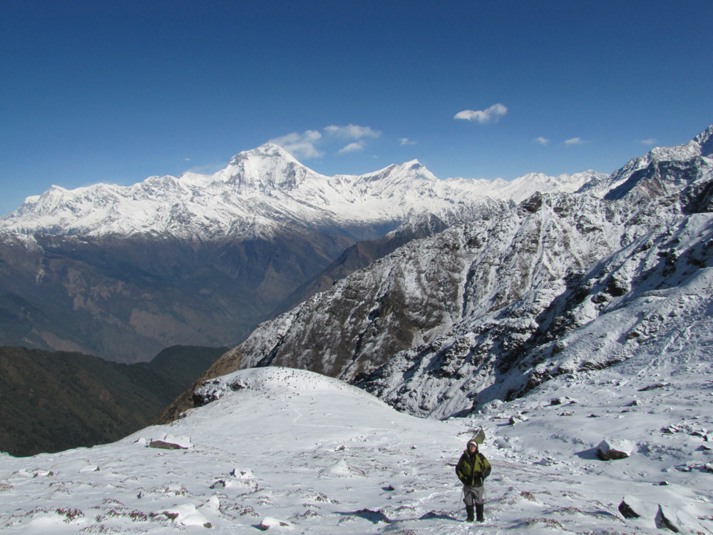 Главная Аннапурна отсюда не видна, только пламенный снежный флаг от нее поднимается за Варахой.