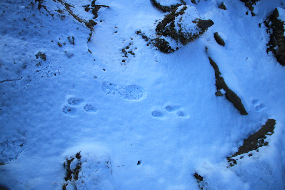 Видели следы «снежного леопарда». Ну правда, какая-то дикая кошка, довольно крупная совсем недавно тут гуляла. Рядом для масштаба наши следы.