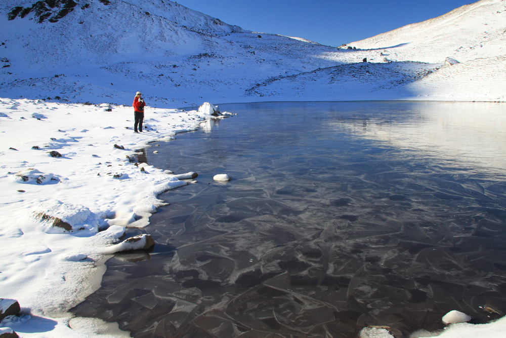 Зашли на маленькое озерцо. Оно было замерзшим, но не заснеженным.