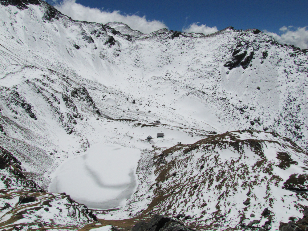 На второй день мы встали пораньше и старались не задерживаться на рассвете, вышли из лоджа в 5:30. Снежники прошли по холоду, фирн держал и без кошек. До правильной речки идти три часа. Она отличается от предыдущих ручейков размерами и кемпингом: есть огороженное пространство под палатки, туалет и пара хозяйственных построек. Если у вас нет палатки, то в крайнем случае переночевать можно под крышей в этих каменных сооружениях.