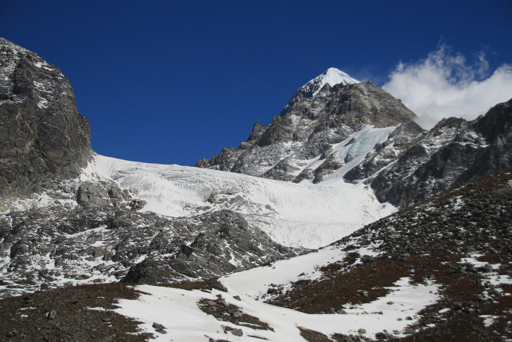 Наверное, лучше было подниматься на левый пологий холм, но мы пошли на правый, потому что туда вели туры. В 11:00 мы поднялись на вершину холма до высоты в 4750 метров. Оттуда виден очень красивый ледопад, но ледник за следующим холмом не виден.