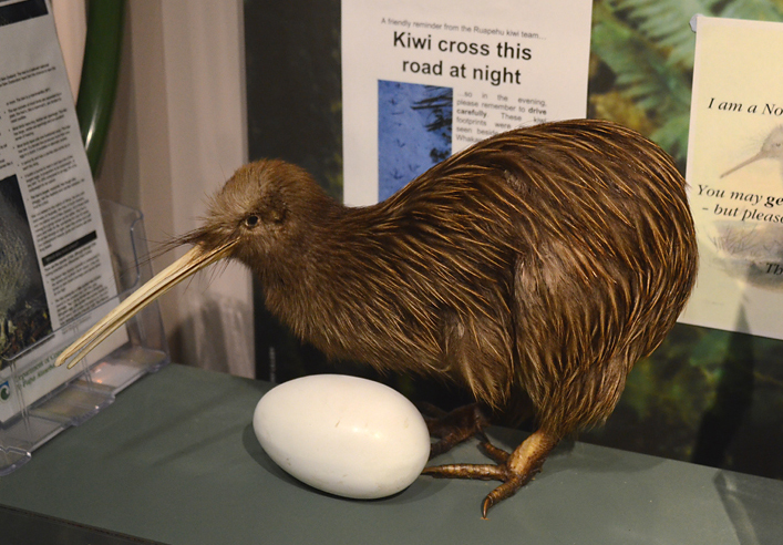 Посреди гейзеров и бурлилок в парке стоит домик птички киви. Единственный раз за всю поездку мы видели ее живую и активную. Птичка ночная, поэтому в домике темно и сфотографировать птичку невозможно. Поэтому придется показать вам чучело из музея.