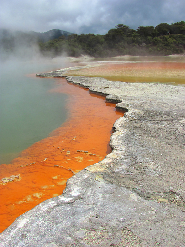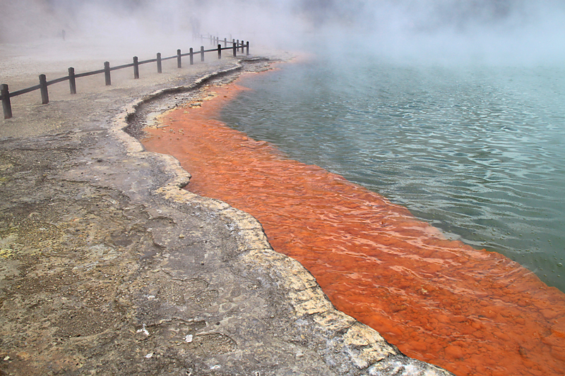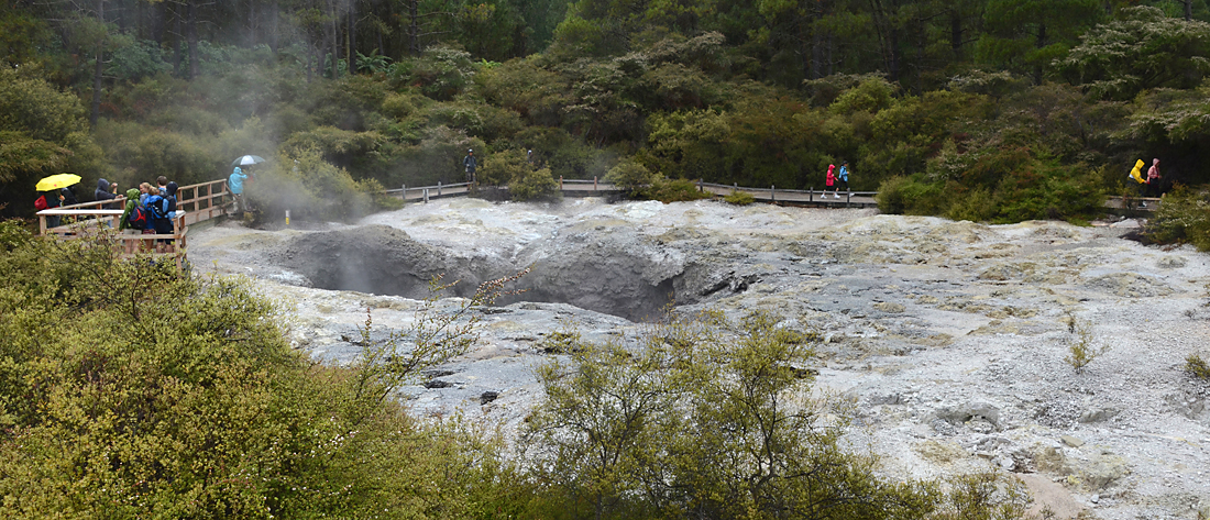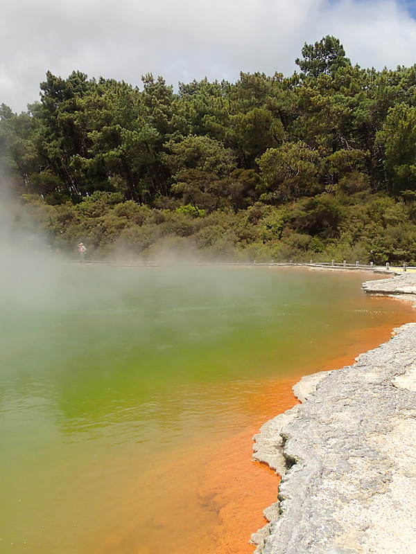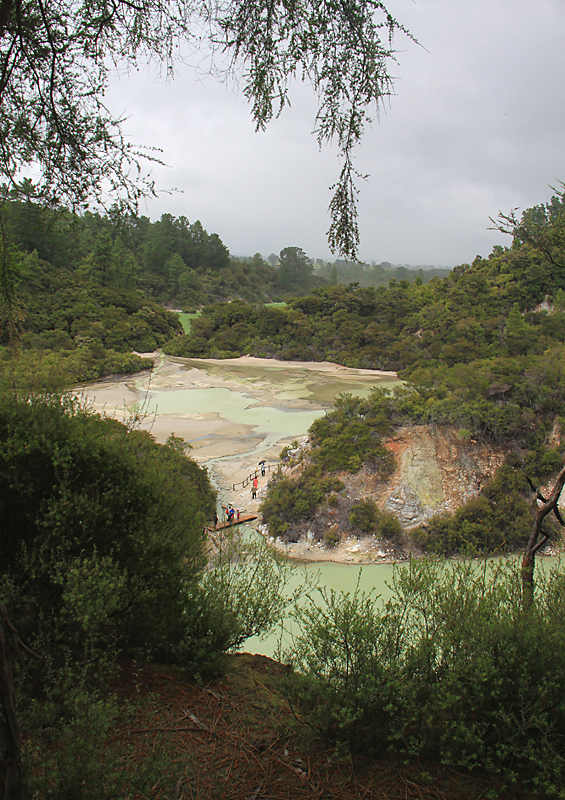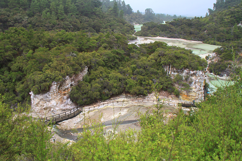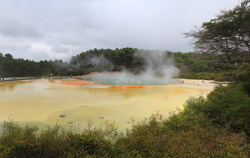 Этот термальный парк считается самым известным и посещаемым в окрестностях Роторуа. Нам впечатление немного испортила погода, было пасмурно и иногда мокро. Однако горячие озера действительно демонстрировали все возможные цвета палитры.