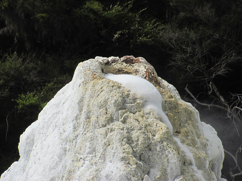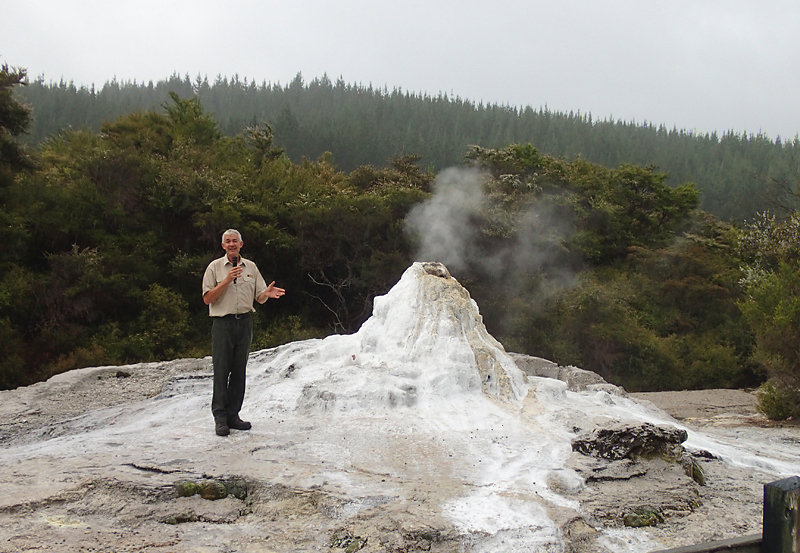 Осмотр мы начали с гейзера леди Нокс. Он находится немного в стороне от парка, просыпается всего раз в день, в 10.15. Как оказалось, просыпается не сам - его грубо и непочтительно будят.
