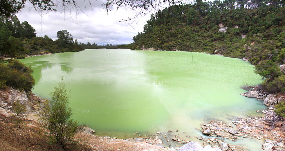 Самое дальнее озеро Нгакоро едкого желто-зеленого цвета. Под солнцем должно быть особенно ярким.