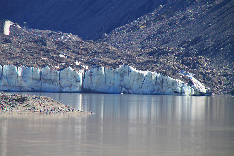 Сам ледник черный от осадочных пород, только на срезе видно немного голубого льда.