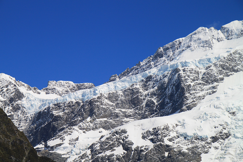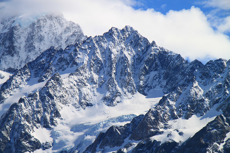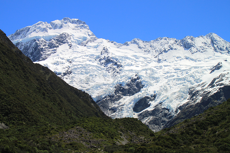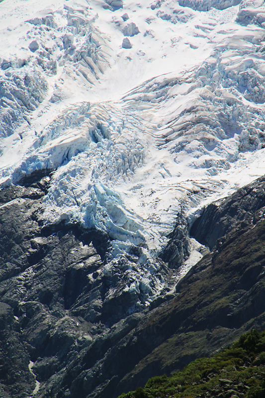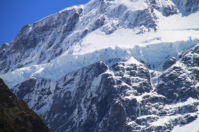 Хоть горы тут (по гималайскам меркам :-) небольшие, но южная широта дает о себе знать - ледники не тают круглый год и выглядят очень серьезно. Эдмунду Хиллари было где тренироваться.