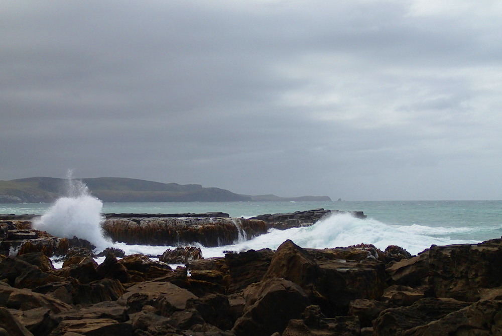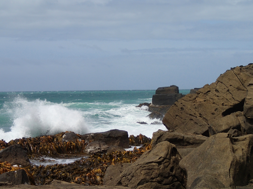 В Porpoise bay (язык не поворачивается назвать маленьких изящных дельфинов Гектора морскими свиньями, так что не знаю, как перевести), пока Ран этих самых дельфинов снимал в профиль и в анфас, я пошла на скалы в правой части бухты. Увидела там волну, которая иногда поднималась выше скал.