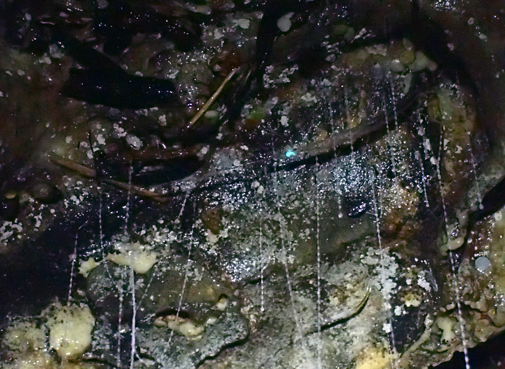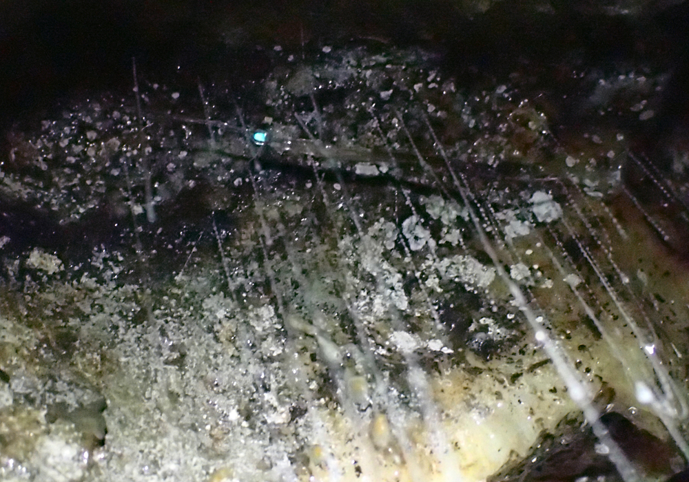 А вот один-единственный светлячок среди нитей, покрупнее. Видно, что это червячок и у него светится голова.