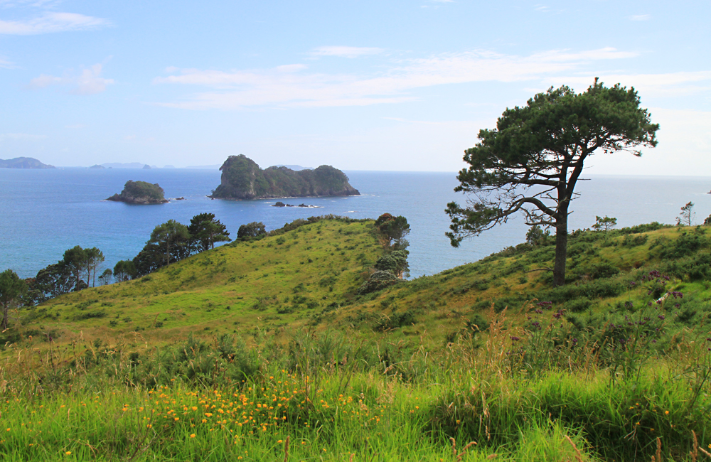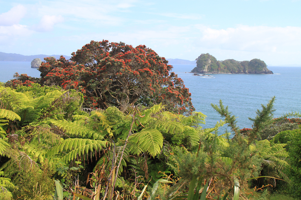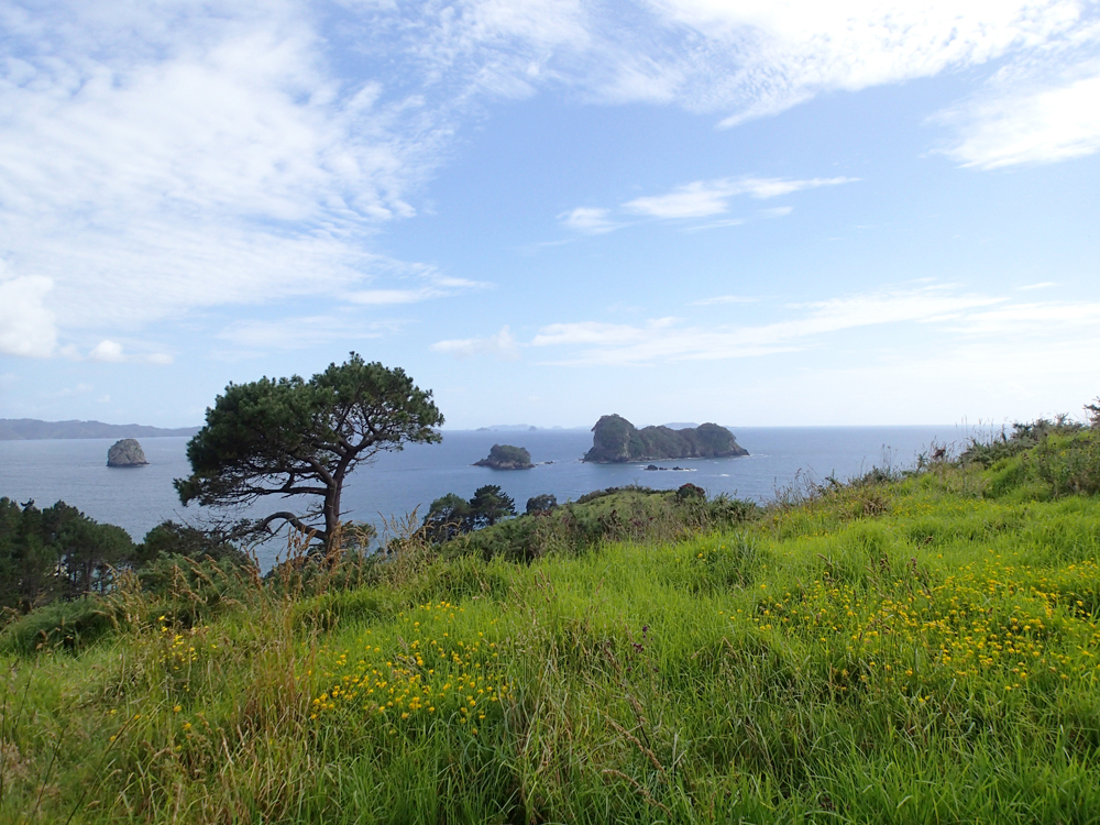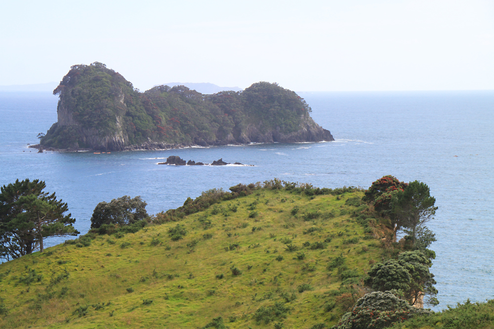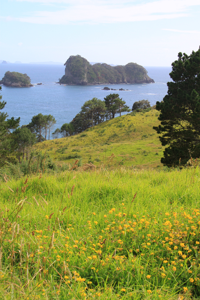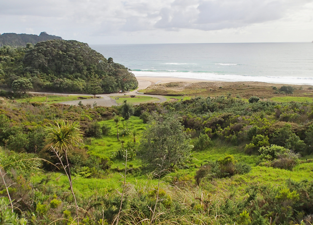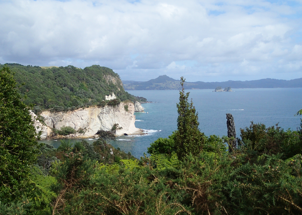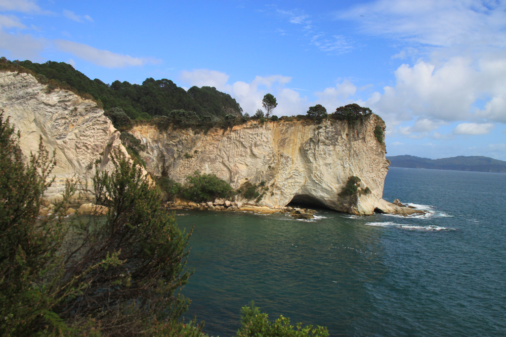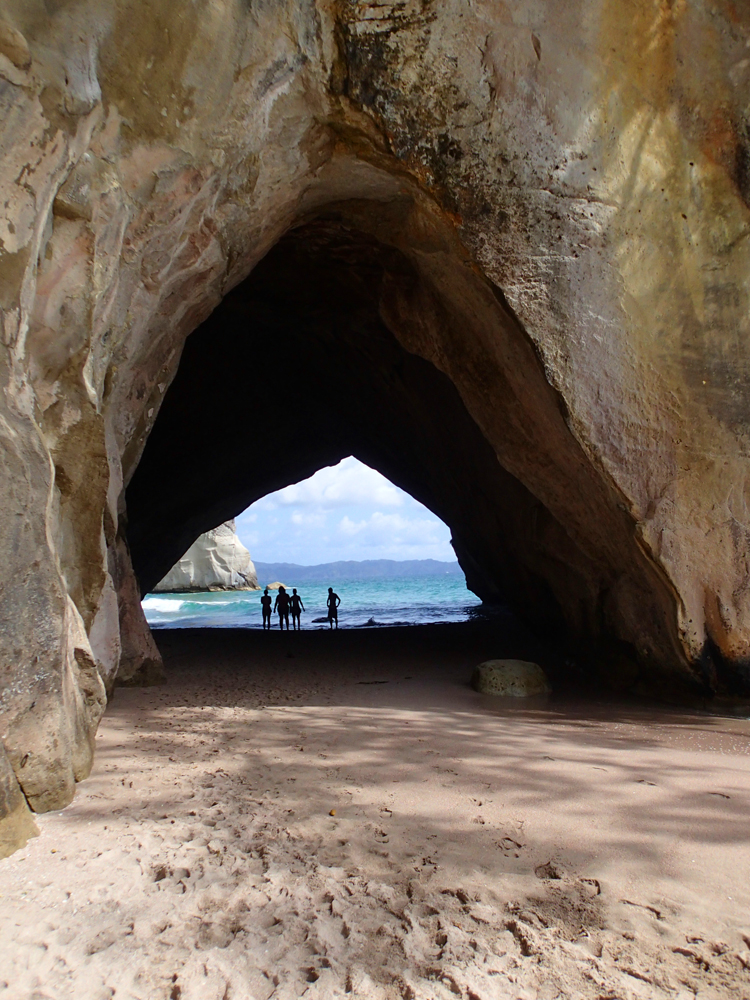 В нескольких километрах от пляжа есть очень красивое место: прогулочная тропа вдоль берега, выходящая на пляж со скальной аркой. Арки такой формы везде называют одинаково — Cathedral, поэтому и бухта со скалой называется Cathedral cove. Мы туда изначально не собирались, просто не знали про бухту. Однако в кемпинге висели такие красивые фотографии, что невозможно было не пойти.