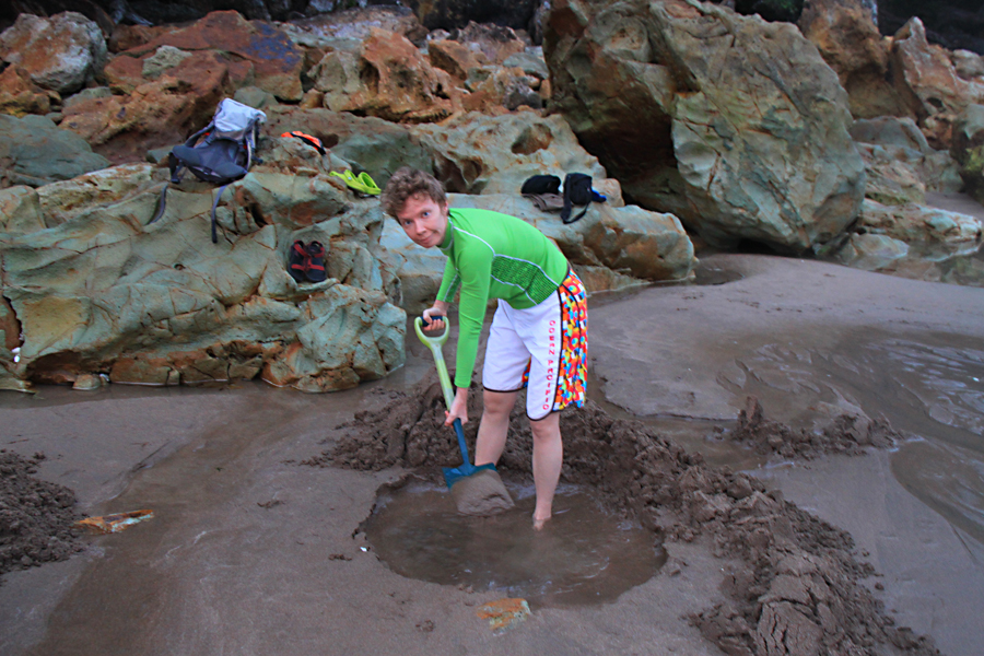 Это место было достаточно горячим, приходилось приносить воду из океана в складном ведре. Зато там долго не заливает. Через час мы просто накупались достаточно и отдали свою ванну другим желающим.