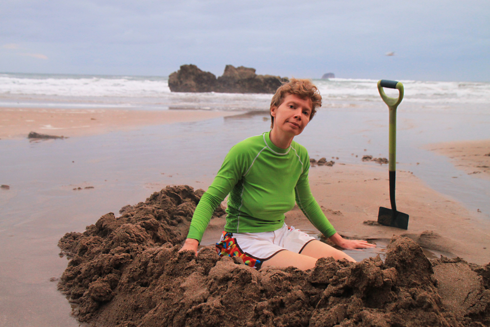 Очень глубоко выкопать не удается, мокрый песок ползет. Хотя мы потом норку углубили, конечно.